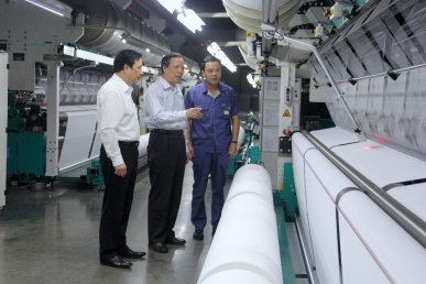 Xu Hui, director of the Haining Municipal People's Congress Standing Committee (when he was the executive deputy mayor of Haining City), accompanied by Mr. Cha Jimin, a Hong Kong industrialist who visited the company, was in Hongda Warp Industrial Company.