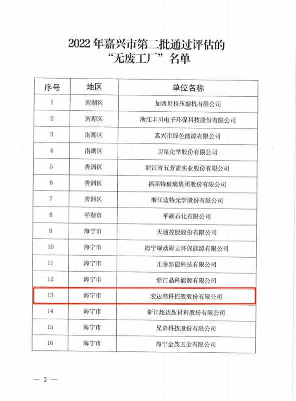 近日,根據(jù)嘉興市生態(tài)環(huán)境局和嘉興市經(jīng)濟(jì)和信息化局文件,宏達(dá)高科被評(píng)為2022年嘉興市第二批“無(wú)廢工廠”。